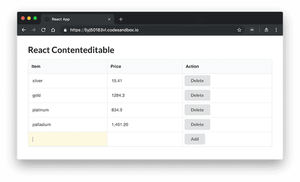 I'm going to make a simple CRUD table in React using the ContentEditable component. I'm going to demonstrate a few issues you might run into, and the solutions I used.